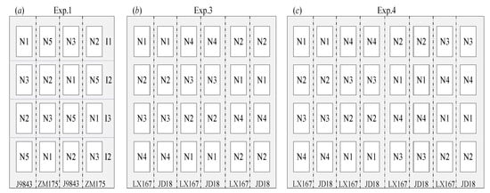 Plots experiments of cultivar, nitrogen and irrigation were designed in Xiaotangshan farm: (a) Exp.1; (b) Exp.3; (c) Exp.4. N1, N2, N3, N4, and N5 indicating five nitrogen fertilizer gradients of 0, 90, 180, 270, and 360 kg/hm2, respectively. I1, I2, and I3 indicating irrigation gradients of 0, 146, and 292 mm, respectively.