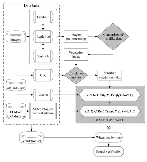 In summary, considering the interaction between genotype and environment, few multilayer nested models that integrate multisource RS data for GPC interaction were available. This study focused on the following issues based on the ground and multisource satellite data of different years and regions: (1) The consistency of data from different satellite sensors was discussed; (2) wheat GPC prediction based on HLM was constructed by considering the interaction among environmental, genotype, and RS monitoring; and (3) the wheat quality classification with GPC was mapped at regional scale.
