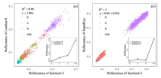 Comparison of spectral reflectance between Sentinel-2 and Landsat-8 (a) and between Sentinel-2 and RapidEye (b). R, G, B, and NIR represent red, green, blue, and near infrared bands, respectively.