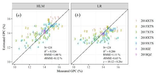 The above-mentioned conventional linear regression model could only analyze problems that involve one layer of data; moreover, the hierarchical linear model (HLM) could effectively solve the problem wherein the traditional linear model has certain limitations in the analysis of multilayer data [33]. HLM had been widely used in many fields with nesting problems (e.g., society, life, and earth science). Wallach et al. [34] developed HLM based on nonlinear response functions to optimize the fertilizer strategy. Li et al. [1] estimated GPC by using the HLM that considered the environmental variations yielded higher accuracy (R2 = 0.58 and root mean square error (RMSE) = 1.21%) than the linear model (R2 = 0.13 and RMSE = 1.73%).