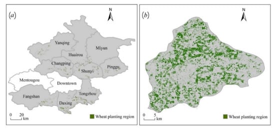 Classification map of winter wheat in Beijing City and Renqiu City: (a) Beijing City; (b) Renqiu City. No wheat was planted in the white administrative area.