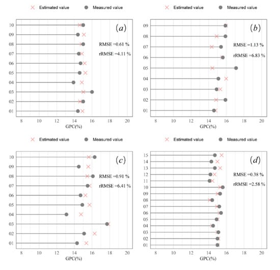The S2 data of 44 points in RQ (10 points), BJ (9 points), XTS (10 points) in 2018, and XTS (15 points) in 2019 were used as verification sets. The predicted result was slightly different from the measured result, with RMSE values for RQ, BJ, XTS in 2018, and XTS in 2019 of 0.61%, 1.13%, 0.91%, and 0.38% and rRMSE values of 4.11%, 6.83%, 6.41%, and 2.58%, respectively (Figure 9). The results show that the HLM coupling environmental factors and gluten was reliable, based on the S2 image data. Large-scale wheat quality prediction could be carried out in the BJ–Tianjin–Hebei region. A technical basis for the wide range application of RS technology in predicting GPC on a spatial scale could be provided.