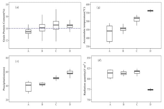 Statistical box map of grain protein content and meteorological data: (a) grain protein content; (b) accumulate temperature; (c) precipitation; (d) radiation quantity. A denotes four districts, namely, Yanqing, Pinggu, Miyun, and Huairou, in the northern mountainous area of Beijing; B denotes two districts, namely, Changping and Shunyi, with relatively flat topography in central Beijing; C denotes three districts, namely, Fangshan, Daxing, and Tongzhou, in the south of Beijing; and D denotes Renqiu City.