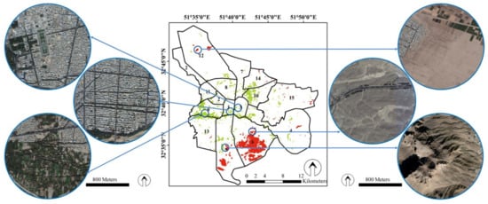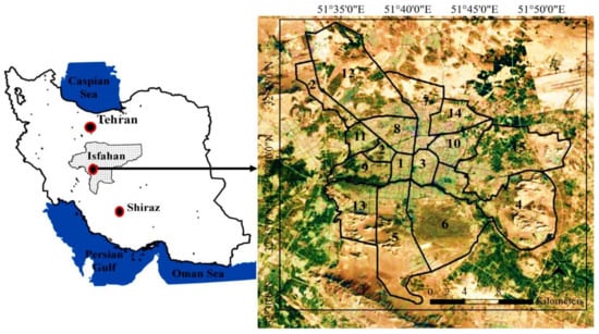 The study area of Isfahan (between 32°30’00’’N to 32°50’00’’N and 51°32’30’’E to 51°52’00’’E) (Figure 1), with a population of 1,961,260 (in 2016) and area of 551 km2, is the third largest metropolis of Iran. Isfahan is one of the most important historical, cultural, political, and religious centers of Iran. This city has always been a destination for tourism due to its ancient attractions and architecture. Isfahan has 15 urban-management regions, the locations of which are shown in Figure 1. The study area has a hot and arid climate, with hot summers and cold winters (maximum temperature: 40.6 °C, minimum temperature: −10.6 °C and average annual temperature: 16.7 °C) [48,49]. The annual precipitation is low (average 116.9 mm) and rainfall occurs mostly in wintertime. The Zayandeh-Rood river passes through the middle of the city and the river shores are covered by green space, but for the last several years the river flow has been cut off in summertime. Furthermore, a large number of immigrants migrated from rural areas to Isfahan and it led to the replacement of natural lands with urban landscapes. The green space per capita in Isfahan is 26 m2, but the green space in all areas of the city is not evenly distributed and is densely colonized along the Zayandeh-Rood river and the city center [48].