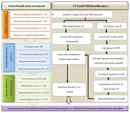 The main flowchart of the study (general health questionnaire-28 (GHQ-28) methodology and retrieving land surface temperature (LST)).