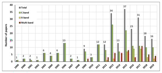 Figure 1 shows the temporal distribution of the scientific papers, with respect to the acquisition band of the sensor. Due to the unavailability of other satellite platforms, all the papers published before 2009 focus on C-band and before 2003 to ERS 1/2 images only.