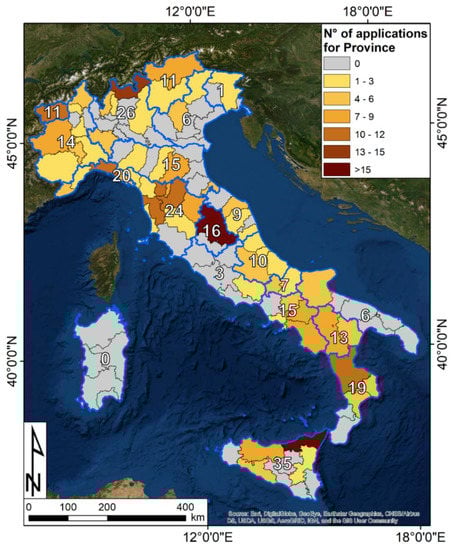 Messina (19) and Perugia (16) are the two Italian provinces with the highest number of InSAR-related applications. In the last 10 years, the province of Messina has been periodically affected by intense rainfall events that triggered several landslides and caused severe damage and casualties. Most of the applications have been used in the municipalities of Giampilieri (e.g., [39,40,41]) and San Fratello (e.g., [40,42,43,44,45,46]) or in the Nebrodi range in general (e.g., [47,48,49,50,51,52]). In the Perugia province, the Ivancich roto-translational landslide (Assisi municipality) has been widely studied with the aid of interferometric products [53,54,55,56,57,58,59,60].