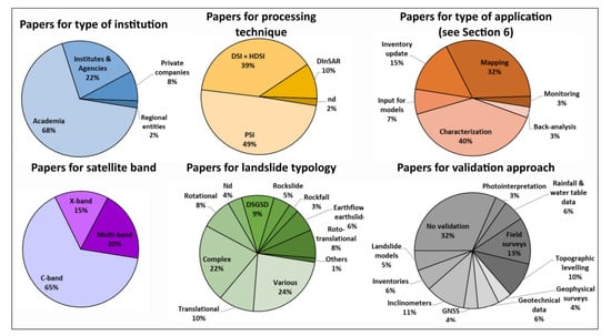 Validation is an important task for many authors, as testified by the percentage (68%) of papers presenting at least one approach to validate the satellite results. The most common validation practices include ground surveys, aimed to collect geomorphological evidence or damage catalogues (13% of the total). Inclinometers (11% of the total) and topographic leveling (10% of the total) are other trusted sources of validation data.