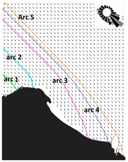 Average wave direction off Damietta Port Said coast, these five arcs from 1 to 5 are perpendicular to the wave crest and ordered southwards to simulate the changes in wave height moving from deep water towards the land. They range is between 1.56 and 2.06 for the study area.