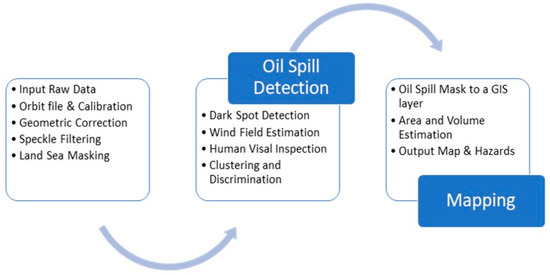 Raw data are processed to map probable oil spills according to the model framework illustrated in Figure 3 in a manual approach using the Sentinel Application Platform (SNAP) software toolbox. The model extracts the dark spots which may be oil spill events based on the contrast difference in the image using a pre-determined threshold.