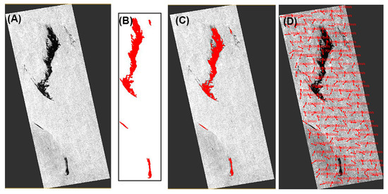 Oil spill clustering using a background window size of 500 pixels and a threshold shift of 3.5 dB and wind vector calculations (A) = raw data; (B) = clustered oil spill; (C) = superimpose of the clustered oil spillover raw data, and; (D) = superimposed by wind vector layer).