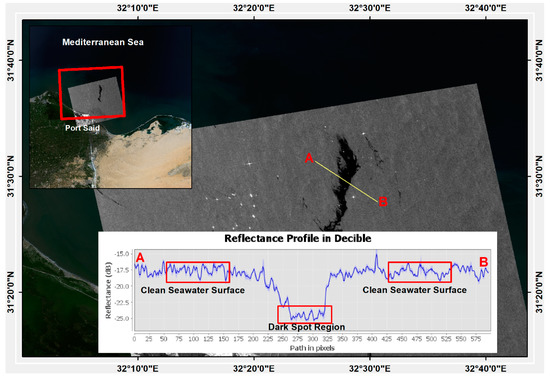 For spectral comparison between the dark spot of the oil spill and the surrounding environment of marine water and/or the vessels, a spectral profile plot over the spill was generated (Figure 6). The brightness of the captured image is a reflection of the properties of the target surface. It shows the comparison of reflectance between the normal seawater surface reflectance (range from −15 to −20 dB), the dark spot of oil (range from −23 to −26 dB), and the ships (range from 0 to 15 dB) that have very high reflectance. This range is relatively fit with the SAR image itself for this area of study. However, threshold ranges from (2 to 4 or 5 dB) is reserved for clean sea surface backscatter. A difference of more than 4 dB exists and this difference is used to determine the clustering threshold for the oil spill.