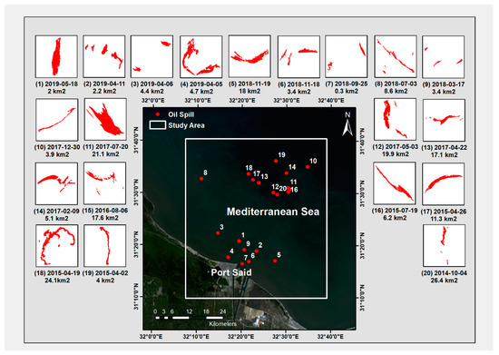 During the period of five years (2014–2019), more than 600 scenes of Sentinel 1 images have been explored online using the Sentinel data hub browser. This online exploration has initially checked visually the Sentinel data for the presence of dark spots. The outcomes of the initial visual exploration identified nearly 70 scenes highly suspected for probable oil spills. Further, processing and model application has resulted in 20 oil spill cases with various sizes and aerial coverage. The identified oil spill cases are almost a few kilometers from the entrance of the Suez Canal. The largest event was observed on the 4th of October 2014 and covered nearly 26 km2 (Figure 4).