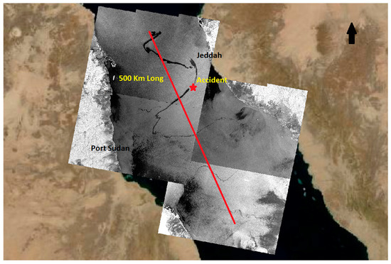Oil spills usually appear for a short period of time especially if the volume of oil spilled is a small quantity such as that of illegal ship discharges. A field check is not an easy task and requires real-time monitoring using aerial surveillance to obtain data on the real incident of oil pollution. Therefore, a simple approach to validate the method and check the efficiency of the model is to reiterate it on a real recorded accident and compare the results. Recently, an oil spill incident happened on 11th of October, 2019 at 5 a.m. local time in the Red Sea; the Sabiti oil tanker had an accident near Jeddah port in the Red Sea. Two reservoirs of crude oil on the ship were damaged and caused massive oil leakage to the sea [26]. This oil slick appeared in four raw Sentinel 1 scenes on 13th and 14th October as shown in Figure 6. When processed and reiterated, the model of the satellite data on these dates using a threshold of 3 dB clustered the oil spill in the Red Sea covering an area of about 1500 km2 (Figure 8). The model mapped and identified the aerial coverage (cross-section of nearly 500 km long) and pattern of oil spill movement north and south of the location of the incident. The circulation pattern and movement of the oil spill were largely extended to the south of the incident (Figure 8). The model shows a significant level of detection of oil spill cases based on historical records of real cases with more than 90% of the detection of both large and small cases.