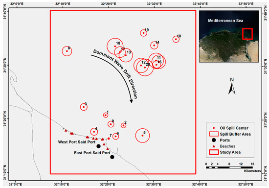 The 20 oil spill cases are within a few kilometers from the coastal zone of Port Said, which will have a direct impact on the ecosystems, social, and economic activities. The flow/current of water is supposed to drift such oil spills to the coastline creating a direct impact on society. The proposed direct hazards of this oil spill will be on tourism activities, industrial activities of fish farms and aquaculture, and other social activities near the coastal areas. The area is inhabited with nearly 1 million population with diverse social and economic activities. For example, the tourism activities engage more than 300 cruises of public ships and 200 yachts that visit Port Said every year. The number of summer tourists that visit Port Said beaches is nearly 400,000 people, which flourishes the tourism industry and creates income for the local community. Such high income from this activity is at risk from the possible oil pollution. More importantly, the area is heavily utilized for fish production, aquaculture, and the fish industry. This means that annual fish production in this area from the Mediterranean Sea is about 9000 tons, and nearly 2500 tons from Lake Manzala, 160 ton from Port Fouad and 17000 tons from licensed fish farms [27]. This industry is engaging a large number of people and contributes to the socio-economic development of the area. The oil pollution could, indeed, create pressure on this fishing activity and increase pressure on the ecosystem and fish production and industry. It might also, due to the wind and flow of the current that controls the drift to the southeast direction, create risks and hazards for the harbor (Figure 9).