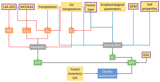 Flowchart of the modeling strategy to assess annual forest net primary production (NPP) described in Section 2. Input data (with yellow background) are described in Section 3.3. Input data with purple borders were derived from remotely sensed data. The quality assessment is described in Section 4.1.