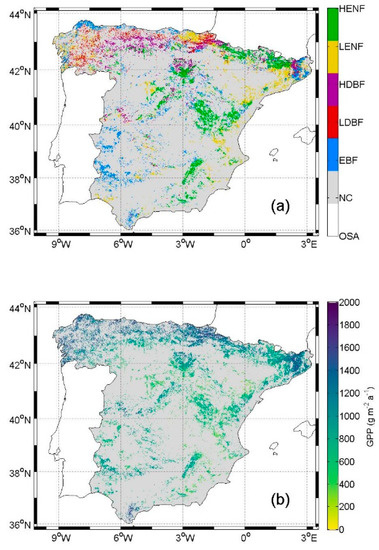 (1) Field measurements are the most accurate and are usually considered as the reference. The eddy covariance (EC) technique allows the estimation of net ecosystem carbon exchange (defined as NPP minus heterotrophic respiration) and total respiration from spectral and micrometeorological continuous measurements [2]. However, it is a site-specific method that only accounts for several hundreds of squared meters around the measurement site. For its best functioning, the required local conditions include flat upwind terrain and lack of horizontal air mass movements. Thus, it is not particularly useful for the study of spatial patterns. Forest inventories (both at regional and national scales) provide periodic estimates of forest attributes such as volume and biomass [3], from which carbon storage can be estimated and categorized by forest type, species, and for different administrative units (e.g., province, region, and state). This methodology can be applied at large scales, but it is expensive to implement in terms of invested resources and time [4]. For example, in the particular case of the study area (peninsular Spain, see Section 3), only one national inventory is performed every 10 years [5].