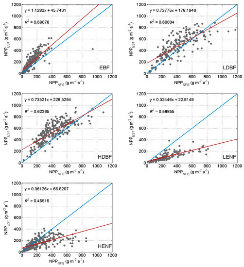 The assessment of estimated NPP per forest type is illustrated by the scatterplots in Figure 3. The largest NPPNFI3 explained variance amongst forest types was obtained for EBF with almost 70% (R2 = 0.69); ~60% (R2 = 0.60, R2 = 0.62, and R2 = 0.59 respectively) was obtained for LDBF, HDBF, and LENF; and slightly less than 50% (R2 = 0.46) for HENF. Small scattering was observed for EBF except for a great NPPNFI3 plot, which was heavily underestimated. A general overestimation, more notable for great NPP values, was also observed. LDBF and HDBF exhibited similar behavior: estimates generally followed the 1:1 line until around 300 g m−2 a−1, where scattering appeared (more for LDBF), and they saturated at around 700 g m−2 a−1. LENF presented a constant underestimation, but with small scattering. HENF exhibited more scattering than LENF, but estimates followed the 1:1 line until around 200 g m−2 a−1, where saturation appeared.