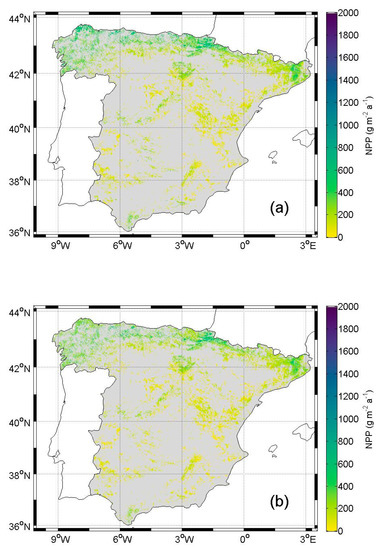 Figure 4a,b show, respectively, the average annual forest NPP calculated using Equation (4) with GPPPEM and with GPPBGC. The spatial pattern was the same in both cases: NPP was larger in the NW and decreases towards the SE, except in the most southern and the most eastern (this one located in the north too) regions, where NPP was also great. NPP calculated with GPPBGC was generally smaller than NPP calculated with GPPPEM. Table 5 summarizes the basic statistics of the mentioned GPPs and their corresponding NPPs per forest type. GPPPEM maxima are greater than GPPBGC maxima for broadleaved forest, but the opposite relationship occurred for needleleaved forests. GPPPEM means were greater than GPPBGC ones for all forest types. NPP maxima and means exhibited a similar behavior. However, these differences do not seem very relevant, especially the differences in the mean values.
