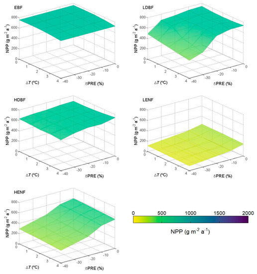 Variations of annual forest NPP due to possible changes in daily air temperature (ΔT) and precipitation (δPRE) caused by future climate change. One case representative of each forest type is shown.