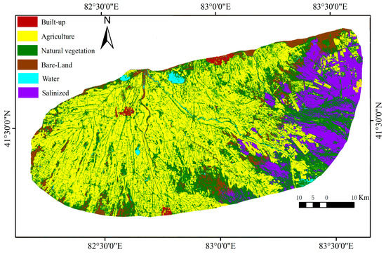 The land cover use of the study area is shown in Figure 2. As shown in Figure 2, there are six types of land cover, which include built-up, agriculture, natural vegetation, bare land, water, salinized. The artificial vegetation is mainly planted in the center of this oasis; meanwhile, the natural vegetation is mainly in the oasis-desert ecotone region where the soil salinization is serious.