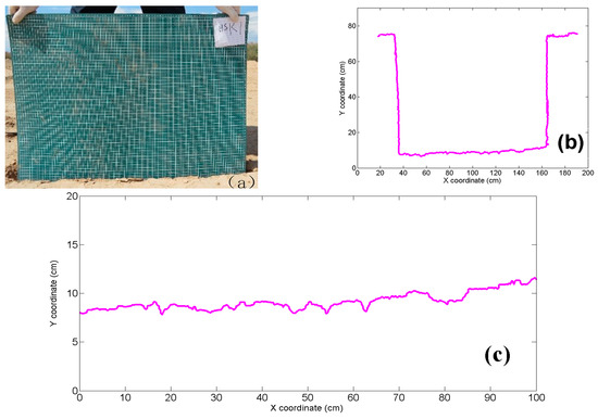 At present, there are two methods to obtain soil roughness: the probe method and laser scanning method. In this study, the probe method was used to obtain the surface roughness, which is a section panel with a centimeter grid (Figure 3a). The specific steps of soil roughness data process were divided into four steps: