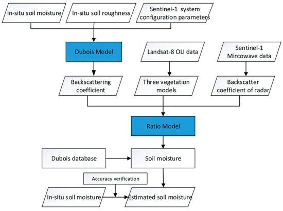 In this paper, the Dubois Model and the Ratio Model were used to derive soil moisture in the Ugan-Kuqa River Delta Oasis. The Ratio Model is used to simulate the vegetation backscattering, and the Dubois is used to simulate the bare soil backscattering. The implementation of the two models’ soil moisture retrieval can be seen in Figure 4, and detailed descriptions of the two models are introduced in the following sections.