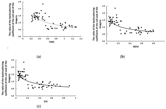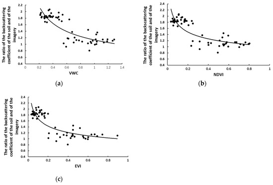 The ratio scatter plots of to vegetation indices (a) VWC; (b) NDVI; (c) EVI.