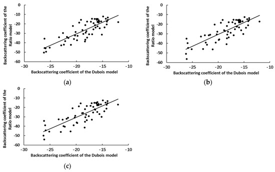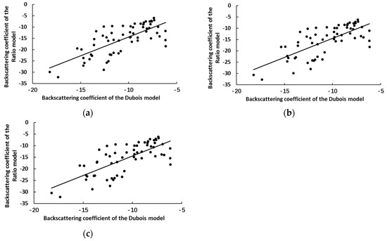As shown in Figure 8 and Figure 9, it can be found that the backscattering coefficient simulated by the Dubois model and the ratio model have a fine linear relationship, and the scatter plots are basically clustered near the 1:1 line, which shows that the backscattering coefficient simulated by ratio model is feasible. As shown in Table 3, the quantitative analysis of the fitting results of the backscattering coefficient shows that when the vegetation index is VWC, the backscattering coefficient has the highest correlation, the root mean square error has the smallest, and the modeling effect is the best.
