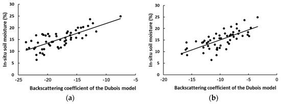 There are two functions of the Dubois model in this research. One is to simulate the backscattering coefficient of bare soil and solve the unknown coefficient in the ratio model. The other is to simulate the backscattering coefficient of bare soil and establish the empirical relationship of soil moisture. Therefore, according to the Dubois model, it can be concluded that when the soil roughness is certain, the backscattering coefficient of bare soil is controlled by soil moisture. Based on this, the Dubois model is used to establish the relationship between soil backscattering coefficient and soil moisture. Moreover, 80% of the in situ soil data (55 soil samples) were used to build the empirical relationship between the in situ soil moisture and backscattering coefficient. Figure 10 shows the scatter plot of the backscattering coefficient of the Dubois model and in situ soil moisture under HH and VV polarization modes.
