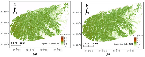 There were differences in the soil moisture retrieval under the three vegetation indices, which proved that the model conducted was suitable for deriving soil moisture in this oasis region. All of these findings can be seen in Figure 11.