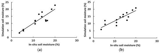 Moreover, 20% of the in situ soil data (14 soil samples) were used to verify the accuracy of the soil moisture model constructed in this paper. The soil moisture simulated by the Dubois model were correlated with the in situ soil moisture under three vegetation indices. The results are shown in Figure 12, and their error metrics, i.e., bias, RMSE, are listed in Table 6.