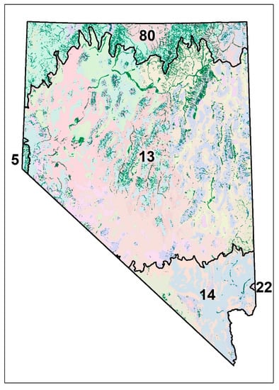 Study area showing riparian areas from the Map of Riparian Vegetation of Nevada (MRVN) in dark green and 45 Level 4 (colors) ecoregions. Level 4 ecoregions are nested within Level 3 ecoregions (black lines) including the Northern (80), Central (13) and Mojave (14) Basin and Range, the Sierra Nevada (5), and the Arizona/New Mexico Plateau (22).