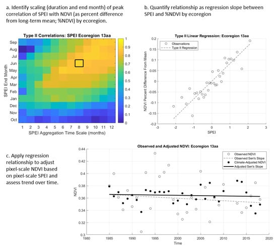 Methodological steps for (a) identifying the timescale of the strongest relationship between Standardized Precipitation–Evapotranspiration Index (SPEI) and percentage change in Normalized Difference Vegetation Index (NDVI) for each ecoregion in the study area, (b) quantifying the regression slope of that strongest relationship, and (c) applying the ecoregional relationship to the pixel scale to adjust for drought and analyze resultant trends over time.