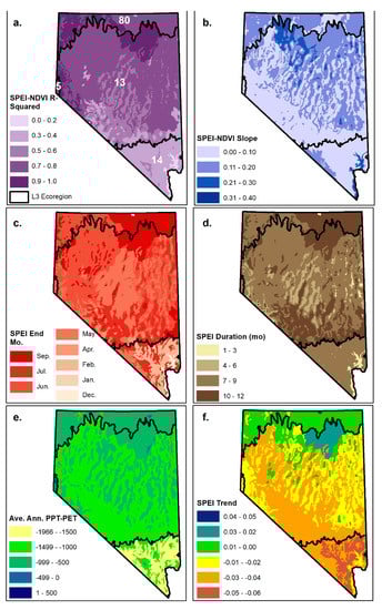 We quantified relationships between each ecoregion’s annual percent change in NDVI and Standardized Precipitation–Evapotranspiration Index (SPEI; []); a multi-scalar drought index representing the difference between precipitation (PPT) and potential evapotranspiration (PET). We selected this index because preliminary analyses indicated that NDVI was more strongly related to the difference between PPT and PET than to PPT or PET alone (see Supplementary Figure S1) and because strong relationships have already been found in Nevada for SPEI compared to hydrologic droughts (i.e., streamflow and reservoir levels []) and compared to wildland fire potential and dead fuel moisture []. PPT and PET (based on Penman Monteith reference evapotranspiration []) data were obtained from the 4 km spatial resolution GRIDMET dataset [], which is based on a sparse observation network in Nevada and has the potential for error at the weather scale such as light (drizzle) or extreme precipitation events [] and temperature inversions that are common in complex terrain []. We acknowledge this limitation on the accuracy of GRIDMET. However, using climatic time scales (one month and longer) and standardized values reduces uncertainty in GRIDMET as regional climatologies are well captured. Moreover, NDVI, PET, and PPT exhibit a complementary relationship according to well-known complementary theory where atmospheric water demand, water use, and vegetation vigor are inherently linked [,]. Prior to analysis, we resampled the GRIDMET to 30 m resolution with bilinear interpolation to match the resolution of Landsat. Similar to the treatment of NDVI data, we averaged the PPT and PET across all riparian pixels within each ecoregion.