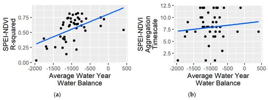 Relations between ecoregional long-term (1984–2018) average water year water balance (PPT-PET) and (a) the strength (indicated by R-squared) of the relationship between optimal Standardized Precipitation–Evapotranspiration Index (SPEI) timescale and late summer NDVI (as % difference from long term average) and (b) the optimal aggregation timescale at which the correlation between SPEI and NDVI is maximized.