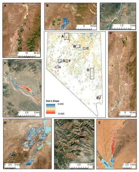 Statewide drought-adjusted trends in riparian areas (Figure 1), with 30 m resolution results aggregated 100x for visualization purposes (center) and at native resolution for select locations in the study area, including Quinn River Valley (A), Boulder Valley (B), Dixie Creek (C), the White River Valley (D), the Lower Virgin River Valley (E), the Clan Alpine Mountains (F), Stillwater National Wildlife Refuge (G), and the lower Walker River (H).