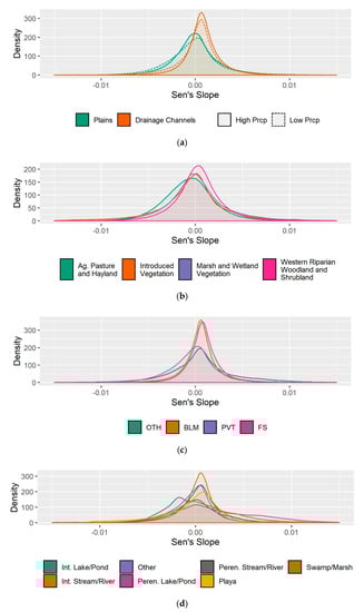 Distributions of drought-adjusted Sen’s slopes for landform and precipitation classes (a), riparian land cover type (b), land ownership (c), and water bodies and streams (d).