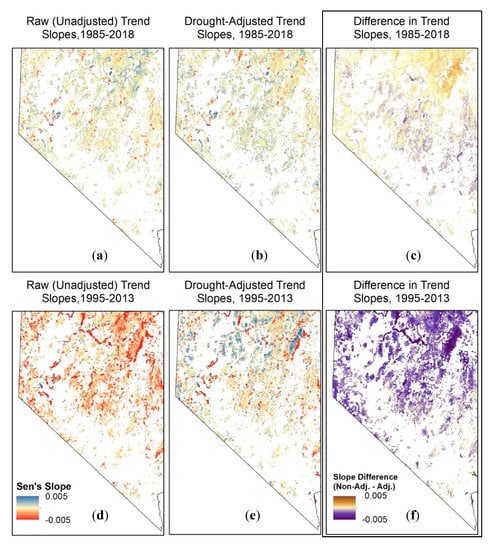 Because there was little trend in SPEI during 1985–2018, the differences between the raw and drought-adjusted trends over the entire time series were relatively small. In contrast, the differences between the raw and drought-adjusted trends for the 1995–2013 demonstration time period during which there was a decreasing trend in SPEI over much of the study area that was quite large (Figure 8). Moreover, in the absence of the drought adjustment, trends are consistently negative across the state due to the drought effect, and localized areas of known anthropogenic disturbances (Figure 5) are less distinguishable from strong and variable trends in surrounding areas (Figure 8).