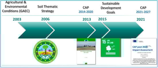 Before trying to put in place the Soil Thematic Strategy, the EU promoted a more environmentally friendly agriculture by introducing the so-called cross-compliance mechanism in the Common Agricultural Policy (CAP) reform of 2003 [7]. With the introduction of the cross-compliance mechanism, farmer support payments were conditioned on the adoption of environmental, animal welfare and food safety standards. This led to the definition of Good Agricultural and Environmental Conditions (GAEC), first established by the Council Regulation No.1782/2003 and subsequently Council Regulation (EC) No 73/2009. Since 2009, EU Member States have the compulsory requirement to keep their land in good agricultural and environmental conditions under the CAP [8]. The introduction of the GAEC was a further legislative effort to promote prevention and mitigation of soil erosion and maintenance of soil organic matter.