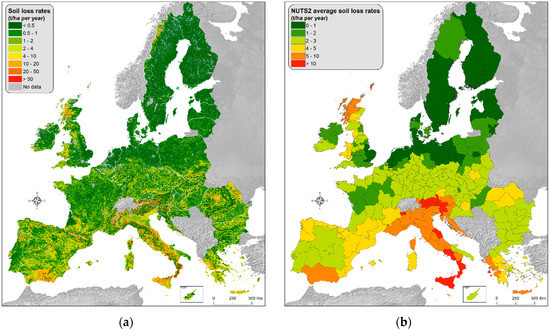 Soil formation rates found in the literature vary quite significantly as early studies report rates of 0.05–0.5 mm per year (≈ 1 t ha−1 yr−1) [61] or 1.4–2 t ha−1 yr−1 [62], while recent ones suggest that soil production can be 3.2–4.5 t ha−1 yr−1 [63]. Around 25% (948 × 103 Km2) of the potentially erosion-sensitive study area has soil loss rates above 2 t ha−1 yr−1 (Table 3). Comparing the soil loss rates, which only partially represent all soil erosion processes (gullying, wind erosion, harvest erosion and piping are not included in this study) [53], we conclude that the total soil loss rates are much larger than soil formation rates in large parts of the EU and mitigation measures are therefore very urgent.