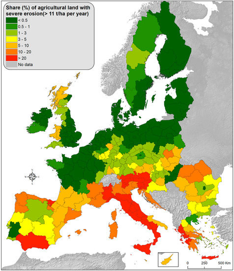 As the agri-environmental policies are implemented at regional level, we have aggregated the soil erosion rates per region (Figure 4). For the indicator “percentage (%) of agricultural area affected by severe erosion (>11 t ha−1 yr−1)”, we estimate that ca. 6.6% of the total agricultural area in the EU suffered from severe erosion in 2016. In those 14.2 million ha of agriculture area suffering from severe erosion (including permanent crops, grasslands and pastures), further policy interventions are required to halt severe erosion.