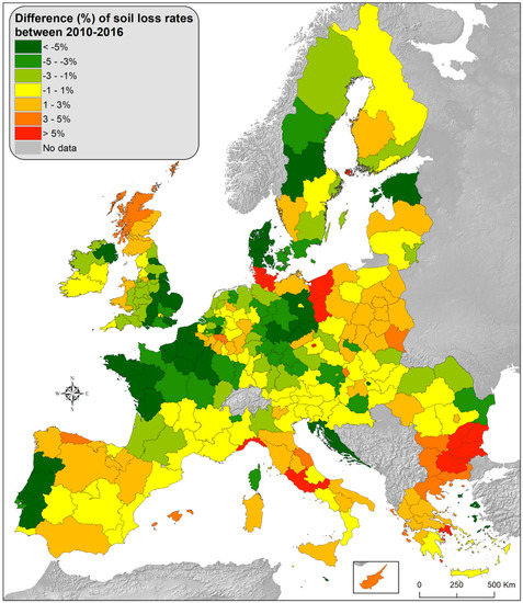 The soil organic carbon changes in such a short period (6-years) are not significant. Soil properties, used in the RUSLE2015, do not change in 6 years-time and the topography is not significantly altered. Therefore, for the estimation of soil loss rates in 2016, the erodibility factor [27] and the slope length and steepness factor [28] are set equal to those for the 2010 indicator. The rainfall erosivity is a long-term average of annual erosivity records which has been calculated based on high temporal rainfall records for a mean of 17-years covering the first decade of 2000. As it is difficult to quantify the effect of climate change in terms of erosivity in such a short period (2010–2016), we have used the pan-European R-factor for 2016 [29].