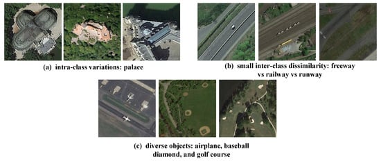 Three major challenges: (a) large intra-class variations; (b) small inter-class dissimilarity; (c) diverse objects in scene images. These examples come from the challenging NWPU-RESISC45 dataset [].