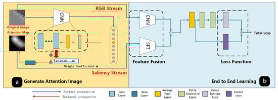 After that, the attention maps and original images are input to the proposed spatial feature transformer (SFT) network and traditional convolutional neural network (CNN), respectively. The high-level semantic feature fusion is performed at the last convolutional layer. Furthermore, to distinguish similar categories in a better way and reduce the intra-class distance, we not only introduce the center loss function [] but also minimize the cross-entropy loss function.
