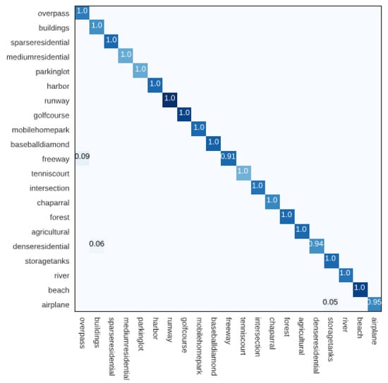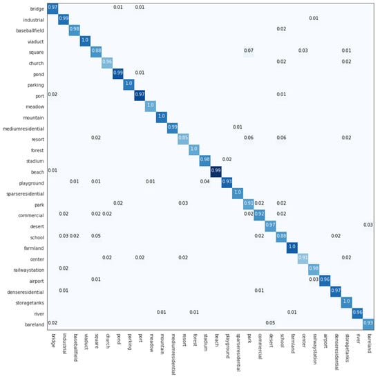 The proposed DDRL-AM framework obtains accuracies more than 97% for each category in the EuroSAT dataset as we can see in Figure 9. That is because between-class similarity and within-class variance is relatively lower in this dataset compared with other three datasets. The proposed DDRL-AM framework can better reduce the between-class similarity and within-class variance for this dataset.