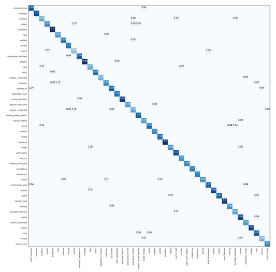 - NWPU-RESISC45 Dataset: This dataset includes a total of 31,500 remote sensing images divided into 45 scene classes. Each class consists of 700 images with a size of 256 × 256 pixels in the RGB color space. The range of spatial resolution is from about 30 to 0.2 m per pixel for most of the scene classes. This dataset contains more than 100 urban areas around the world. The high within class diversity and between-class similarity make the dataset more challenging.
