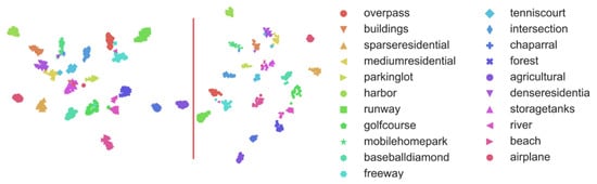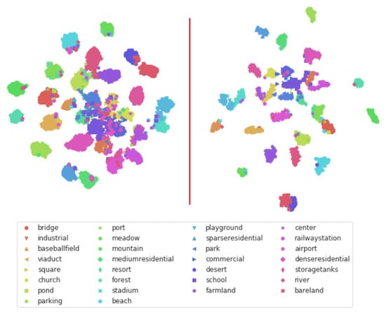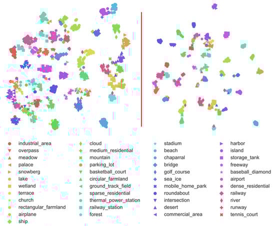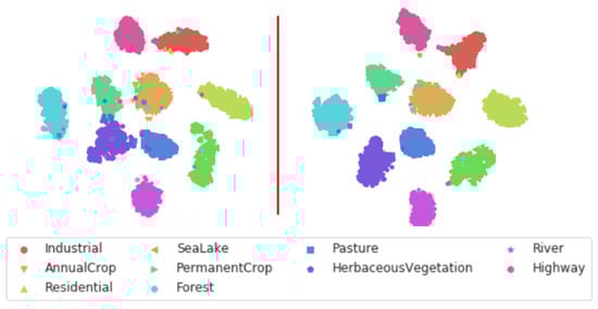 2-D scatterplots of high-dimensional features generated with t-SNE over the EuroSAT dataset. (left) without center-loss function. (right) with center-loss function.