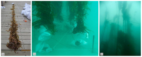 The experimental setting: (a) individual plant being measured at the port after harvesting; (b) setting of the bagged holdfasts in the quadrat; and (c) "dense" forest patch in situ.