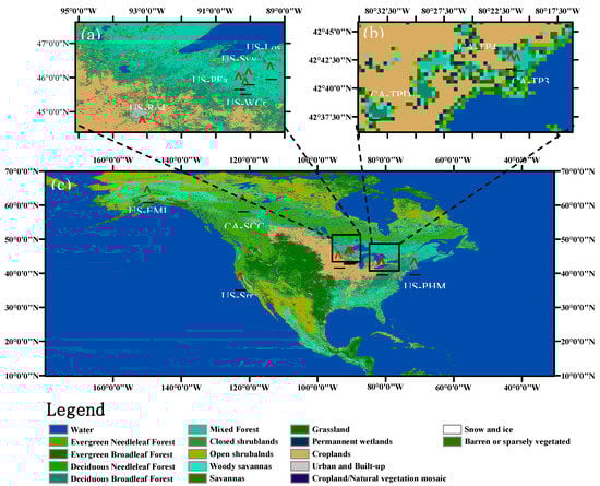 Location and attribute of selected EC sites. (a) An enlarged image showing sites of US-PFa, US-Syv, US-WCr, US-Los and US-Ro4. (b) An enlarged image showing sites of CA-TP3, CA-TP4 and TPD. (c) The location map of the study area; the five-pointed star indicates the location of the study area, and the base map is created in ARCGIS using MCD12Q1 data.